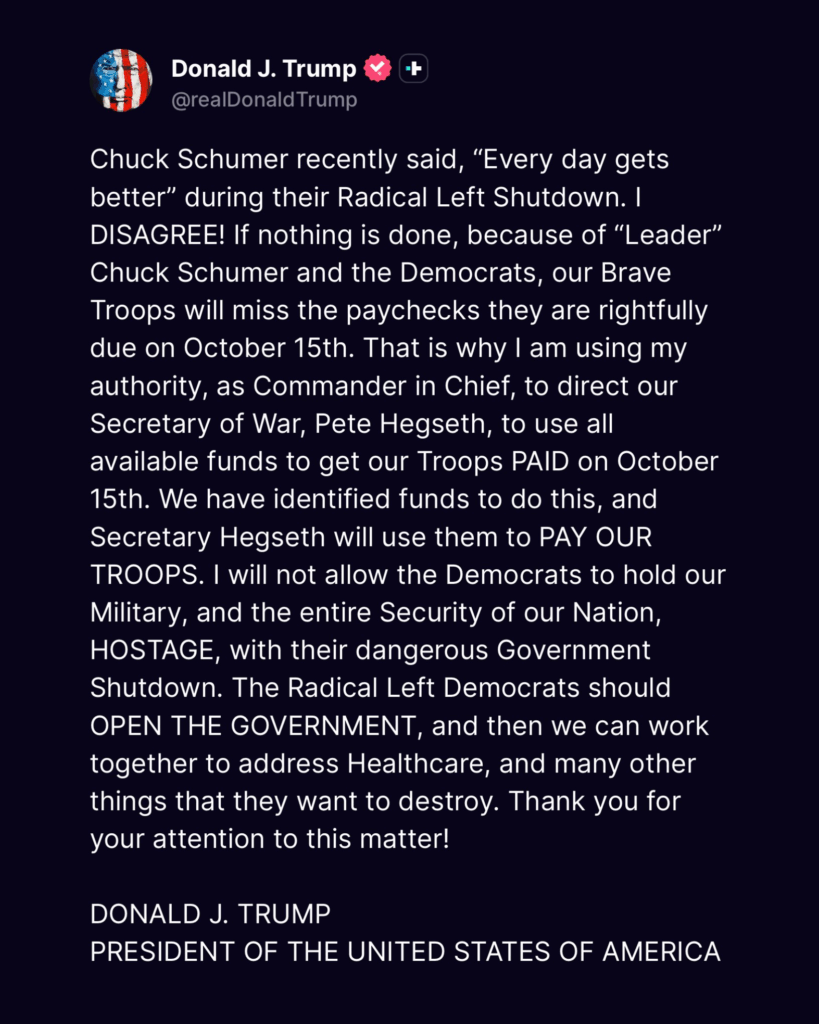 WASHINGTON, D.C. — President Donald Trump announced Tuesday that he has directed Secretary of War Pete Hegseth to use “all available funds” to guarantee that U.S. military personnel receive their paychecks on October 15, despite ongoing government funding disputes in Congress.